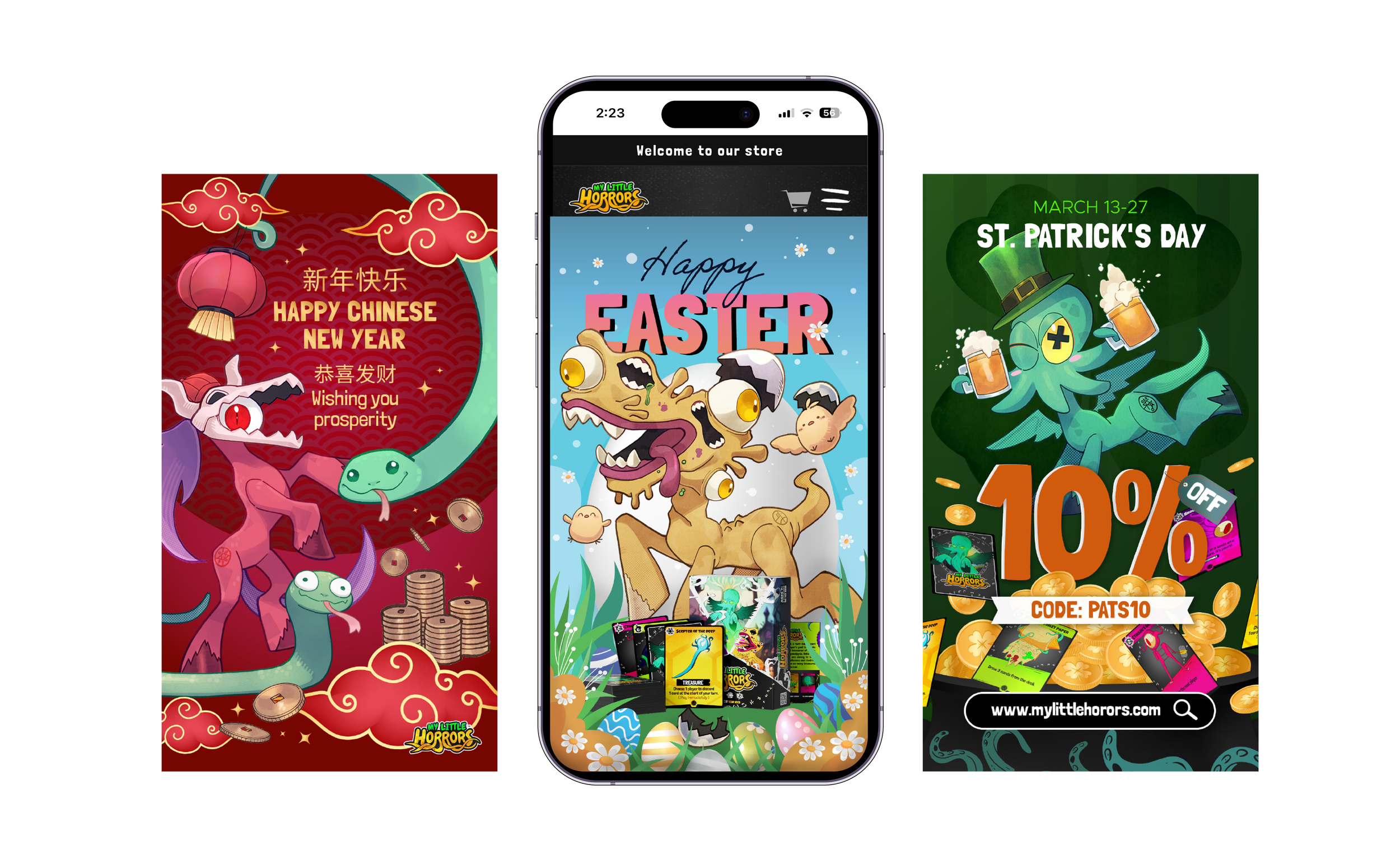 Seasonal campaign banners and website mastheads designed for My Little Horrors promotions, highlighting holiday events,